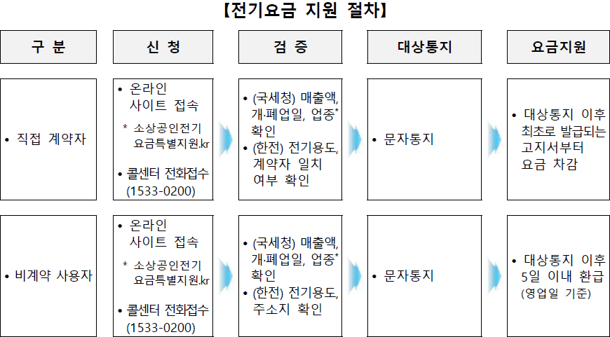 ④ 지원 : 직접계약자는 대상자 통지 이후 최초로 발행되는 전기요금 고지서부터 전기요금 차감이 적용되며, 비계약사용자는 대상자 통지 후 5일 이내 (영업일 기준) 전기요금 납부금액 환급