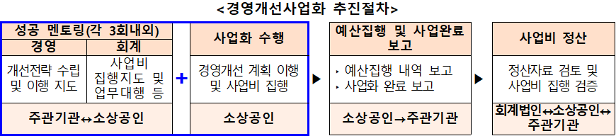 경영개선 전략 이행을 위해 최대 2천만원 (총사업비의 50%)까지 국비 지원 (지원금만큼 자부담)